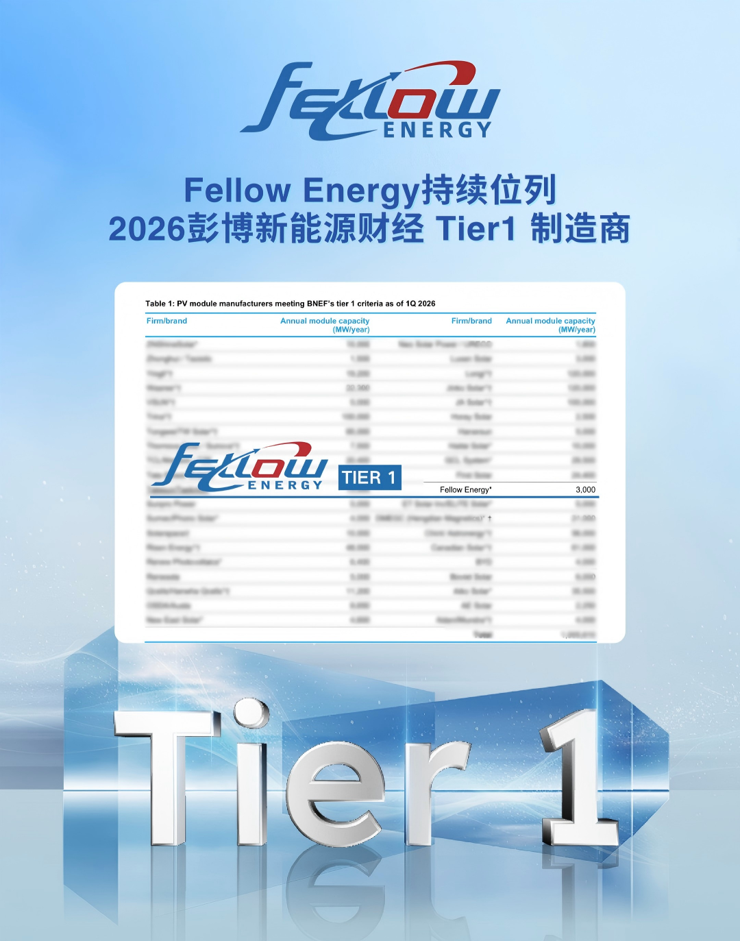 近日,彭博新能源财经(BloombergNEF)宣布了2026年第一季度全世界一级光伏组件制造商名单。土耳其太阳能科技企业 Fellow Energy 依附其持久不变的财政体现、靠得住的产物质量与全世界项目交付能力,再度乐成入选。这已经是该公司持续屡次得到该权势巨子机构的 Tier 1 评级。 连续位列 Tier 1 名单,不仅是对于 Fellow Energy 产物靠得住性与银行可融资性的国际违书,更是对于其全世界化运营系统与战略履行能力的必定。于全世界光伏供给链格式变更的配景下,这一评级凸显了公司营业的韧性与稳健性。 Fellow Energy 的焦点竞争力根植在其垂直整合的制造模式。经由过程实现对于电池与组件出产环节的自立节制,公司确保了从焦点技能到终端产物的品质一致性,并可以或许矫捷相应差别市场对于产物规格与合规性的要求,为其国际化结构提供了坚实支撑。 瞻望将来,Fellow Energy 将继承专注在晋升技能效率与供给链效能,致力在成为值患上全世界客户相信的清洁能源互助伙伴,为能源布局的低碳转型提供不变、高效的太阳能解决方案。