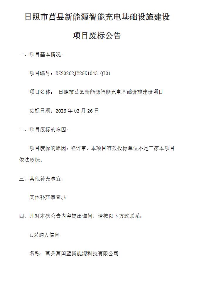 近日,山东日照市莒县新能源智能充电基础举措措施设置装备摆设项目废标通知布告正式发布。
